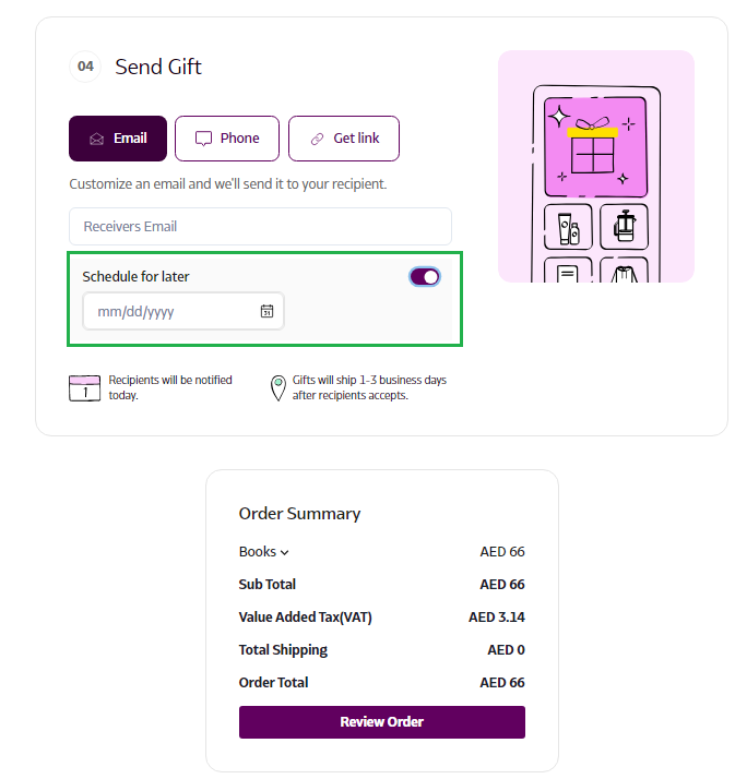 - In the 'Send Gift' section, enable the 'Schedule for Later' toggle and select your preferred delivery date.