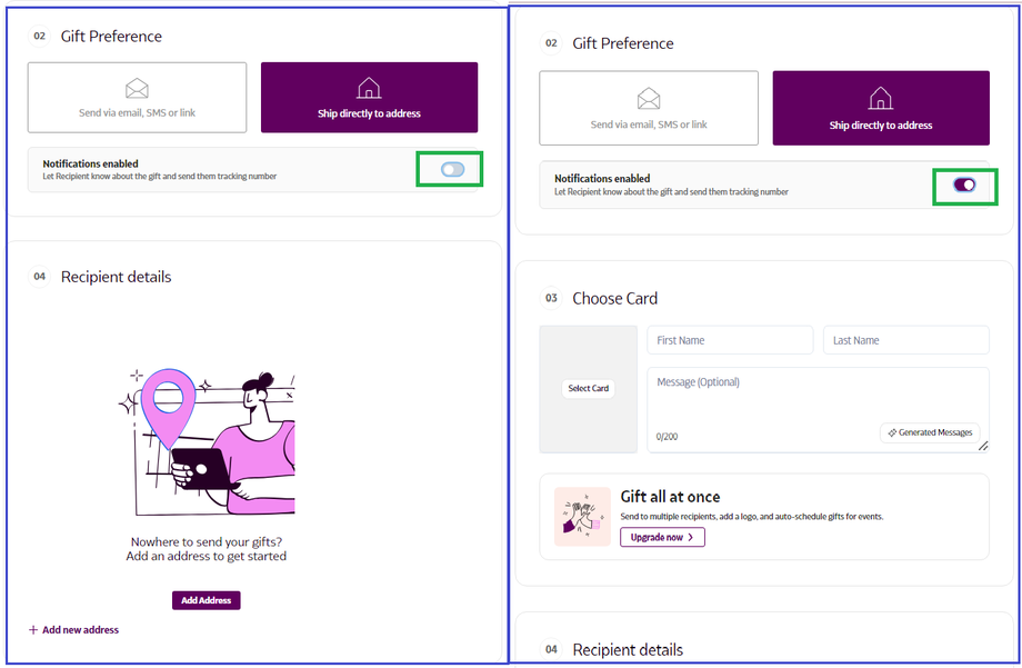 The sender can enter the recipient’s address directly, rather than sending a link via SMS or email. This way, the gift is sent right away without the option for the recipient to accept or swap it, and no card message will be included. You can also choose to send notifications if you’d like the recipient to get updates.